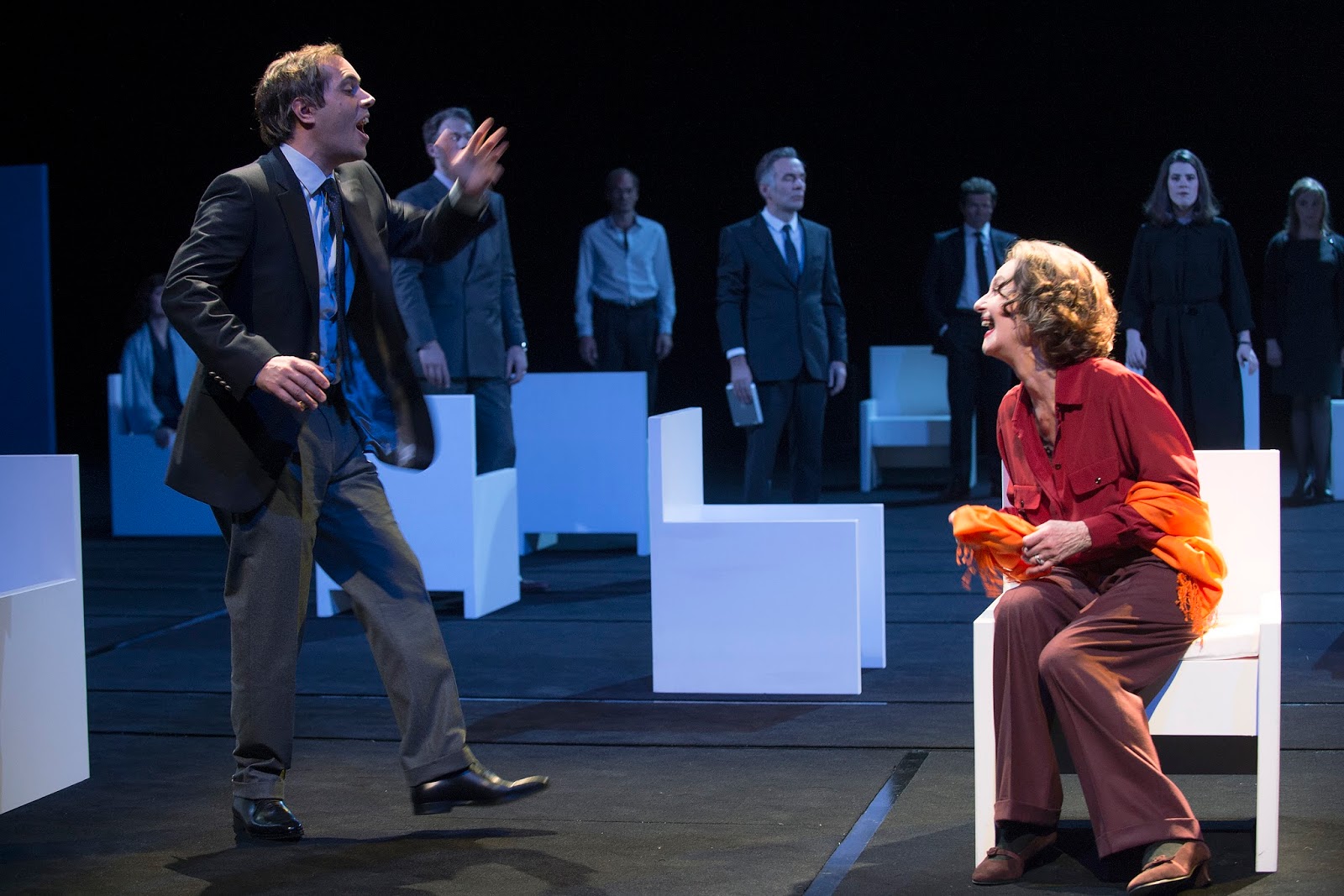 Il convient de remarquer le caractère étonnant de la mise en scène proposée par Chistian Schiaretti. Les scènes s’enchaînent à un rythme effréné. La scénographie permet aux acteurs de s’effacer en s’asseyant sur des fauteuils, dès qu’ils ont fini de jouer une scène. Parler de scène est d’ailleurs impropre. Ce sont plutôt des moments, des épisodes brefs et juxtaposés, des fragments de vie, dont la chronologie échappe assez largement et qui pourtant s’imbriquent à la perfection. En ce sens, la mise en scène est fidèle au théâtre de Vinaver, qui sait se passer d’arrière-mondes et donc de coulisse. Sur la scène, une multitude de fauteuils blancs et anguleux sont regroupés en petits îlots. Le comble du mauvais goût et de la prétention, pour reprendre les termes de Liliane. On se croirait dans un hall de gare aseptisé, ou peut-être bien dans la salle d’attente d’un immense salon de coiffure.
