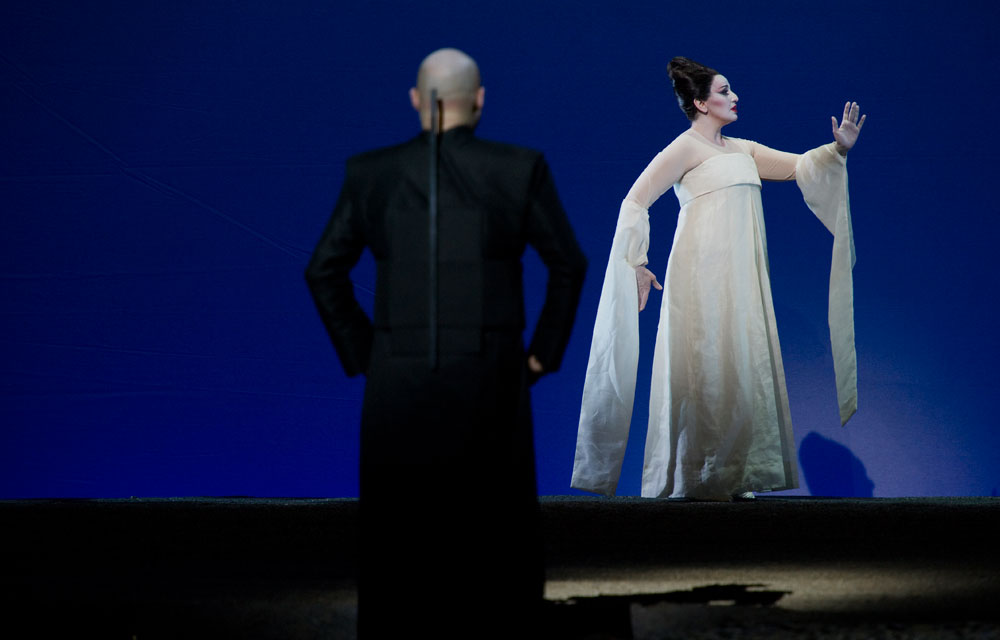 La mise en scène japonisante, dépouillée de Robert Wilson laisse toute la place à une gestuelle symbolique très travaillée, avec des faisceaux de lumière crue qui s’attachent aux visages et aux corps sans jamais les quitter, intensifiant ainsi toutes les passions en jeu dans cette « tragédie japonaise ».