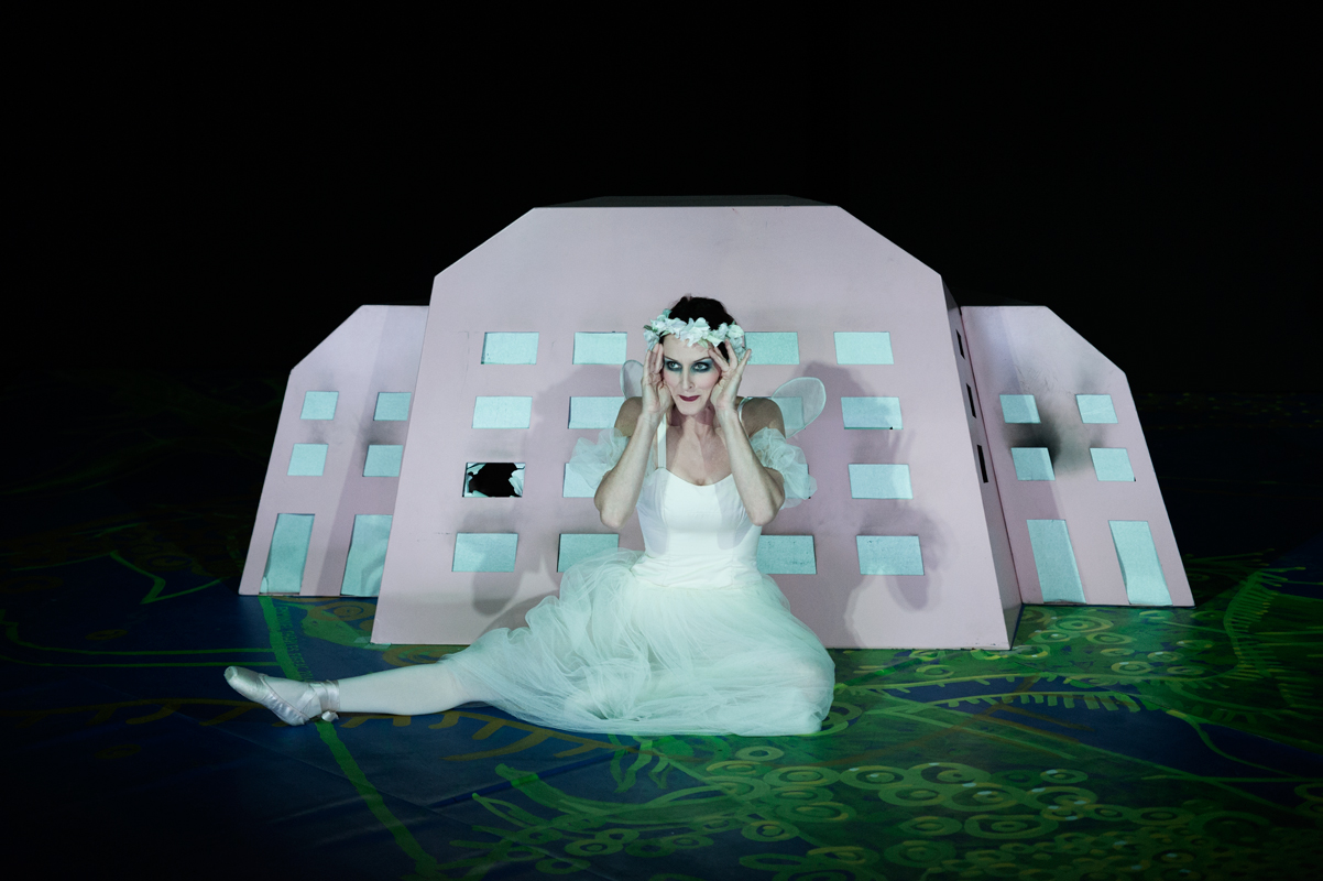 Lorsque le rideau s’ouvre, nous sommes donc avec Zelda, à l’hôpital psychiatrique d’Asheville en Caroline du Nord, où elle est internée jusqu’à sa mort en 1948. La couleur de ce personnage décalé s’annonce tout de suite, sa première réplique étant « Je re-sucre ! », exclamation constituant un comique de répétition qui revient au cours de la pièce, à chaque fois que Zelda se sert de l’alcool fort dans son verre à dent. On voit tout de suite que le décor ne se veut pas réaliste, tout comme la biographie du personnage. Comme Alice au Pays des Merveilles dans sa maison, Zelda dépasse d’une maquette en papier représentant le sanatorium. Elle est en tutu de ballerine, avec de petites ailes blanches accrochées à ses épaules, et son maquillage très appuyée fait un peu penser au personnage de la mariée dans Corpse Bride de Tim Burton.