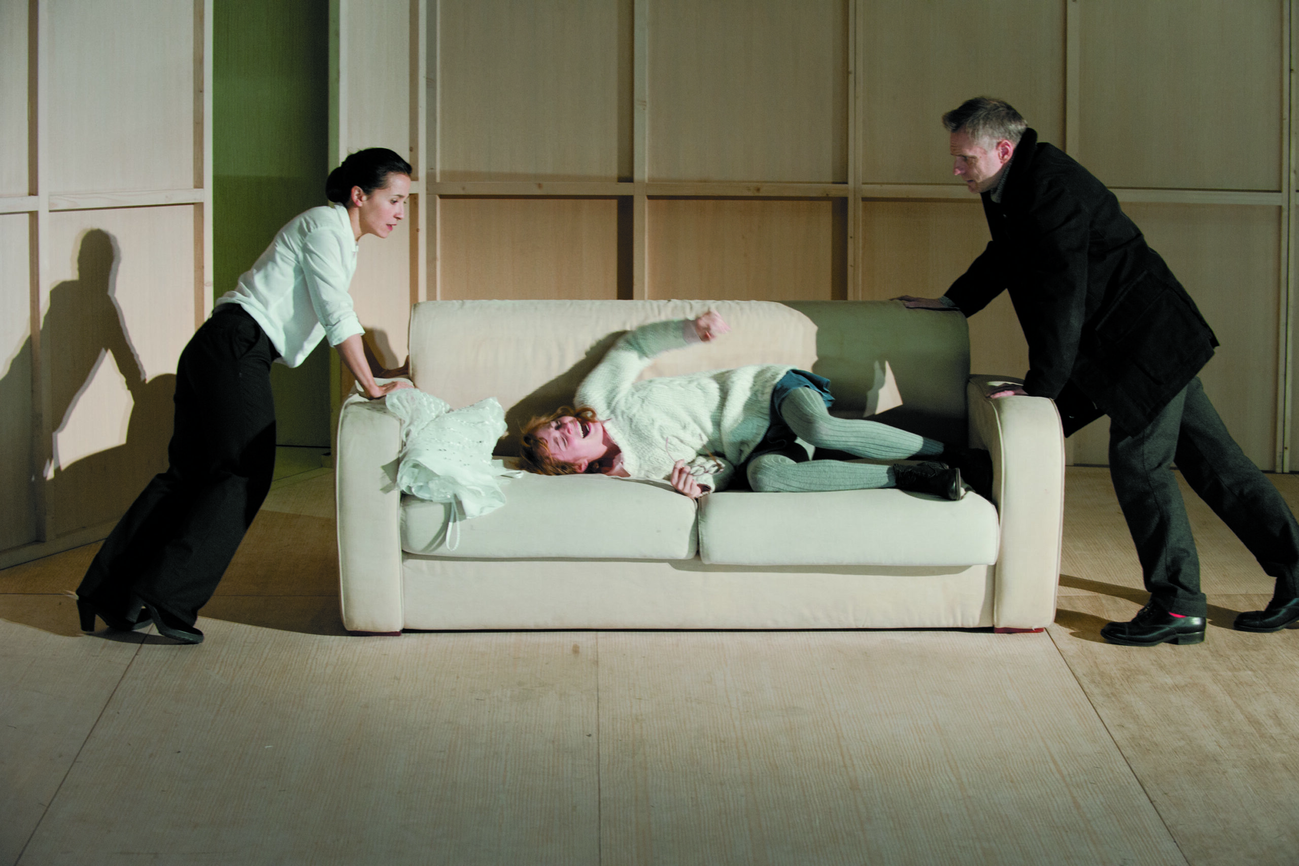 La pièce d’Ibsen est triste. Indéniablement, chacun des personnages est triste, et se débat avec des illusions et se voile la face : Hjalmar (Rodolphe Congé), Hedvig (Suzanne Aubert), Gina (Chloé Réjon). L’arrivée de Gregers (Claude Duparfait), et de sa bien-pensance fait éclater les faux-semblants qui faisaient le terreau de la famille de Hjalmar, soudée par le mensonge vital. Le délitement progressif des liens qui unissent les personnages est admirablement montré, sur scène, par cette distorsion des perspectives de cette maison de bois qui bascule en avant – seule véritable trouvaille scénique qui ne soit pas autant à double tranchant que les autres choix de S. Braunschweig.