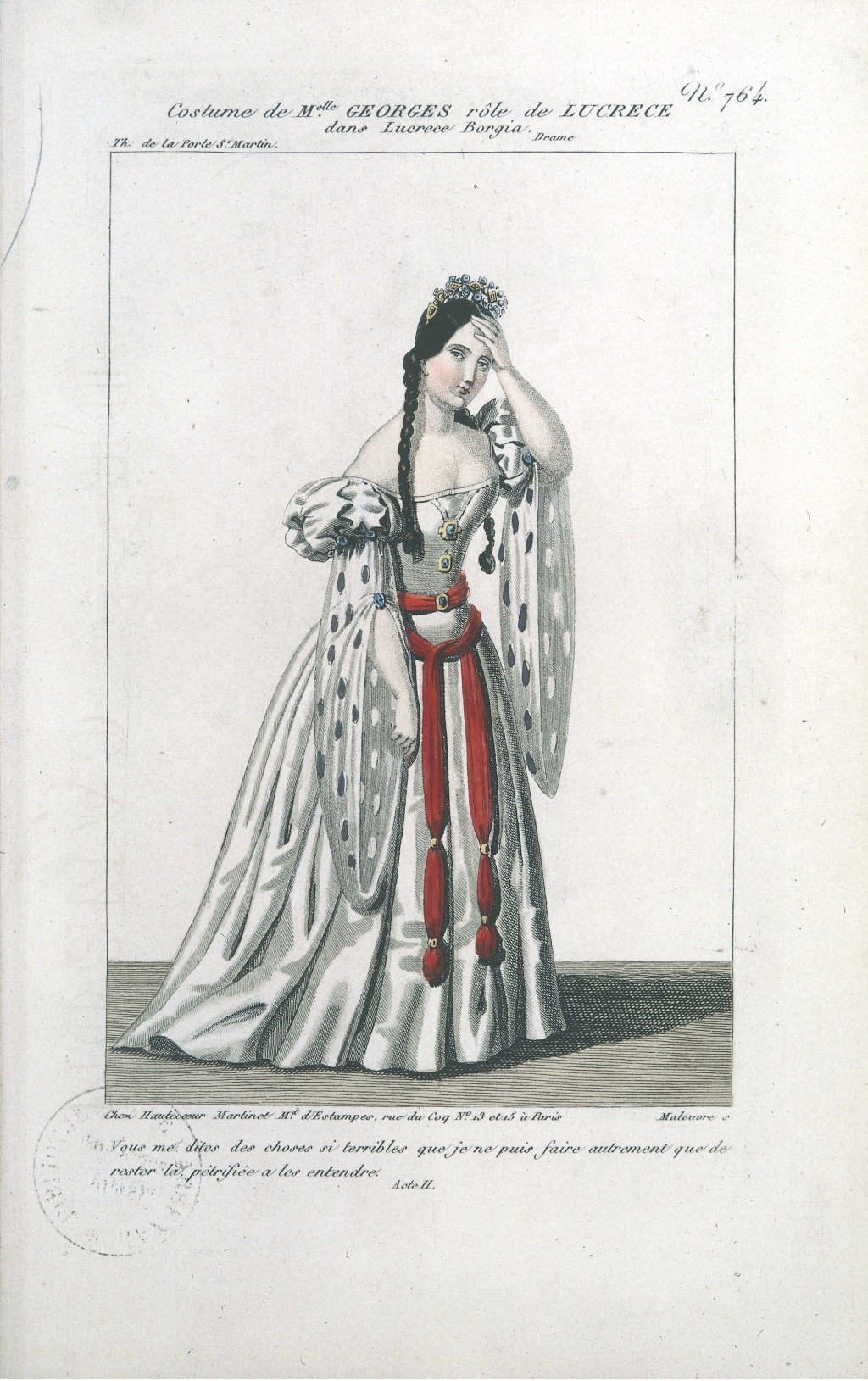 Illustration : Costume de Mlle George dans le rôle de Lucrèce Borgia, 1833, via Wikimedia Commons